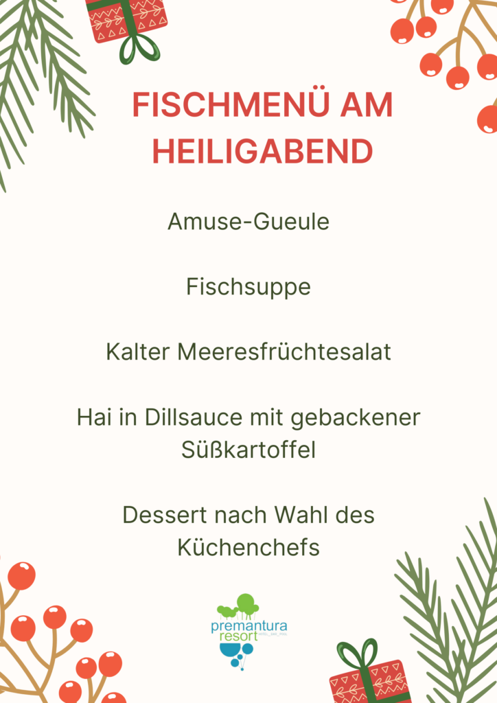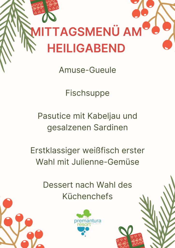 • Fünf-Gänge-Menü am Heiligabend (Mittag- oder Abendessen) – Wahlweise Fisch oder Fleisch