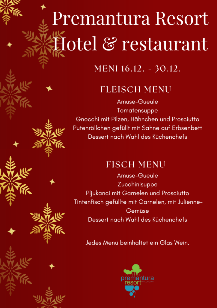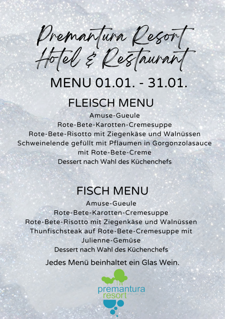• Fisch- oder Fleischmenü in 5 Gängen (Speisekarte siehe Bild) inklusive einem Glas Wein