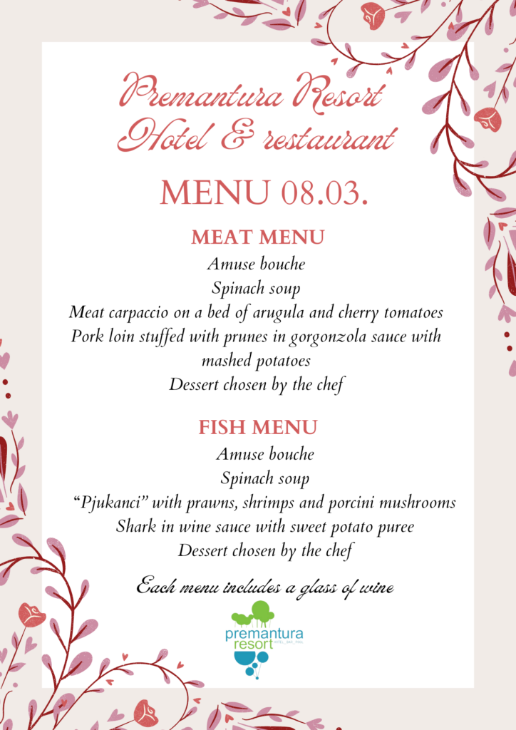On the occasion of Women's Day, we have prepared a special menu designed for enjoyment. In the pleasant ambience of the restaurant, carefully selected dishes, refined flavors and a festive atmosphere ideal for dinner in good company await you. Celebrate Women's Day with top-notch gastronomy and unforgettable moments.