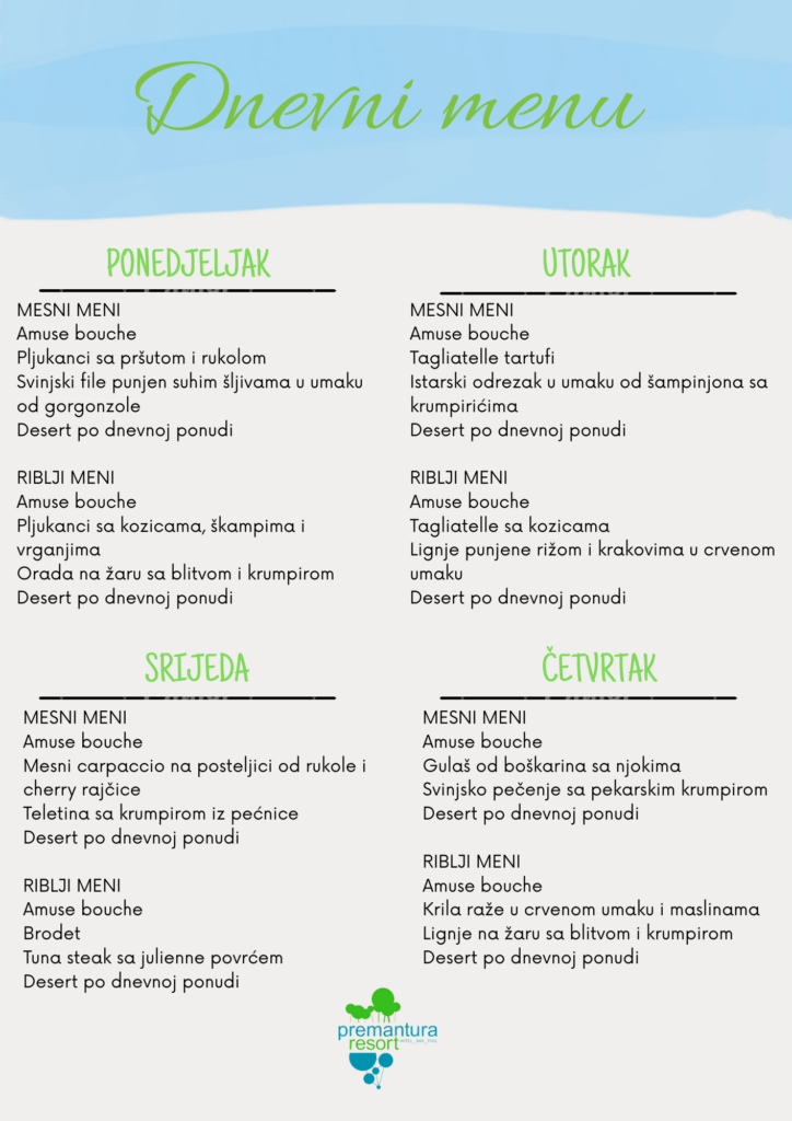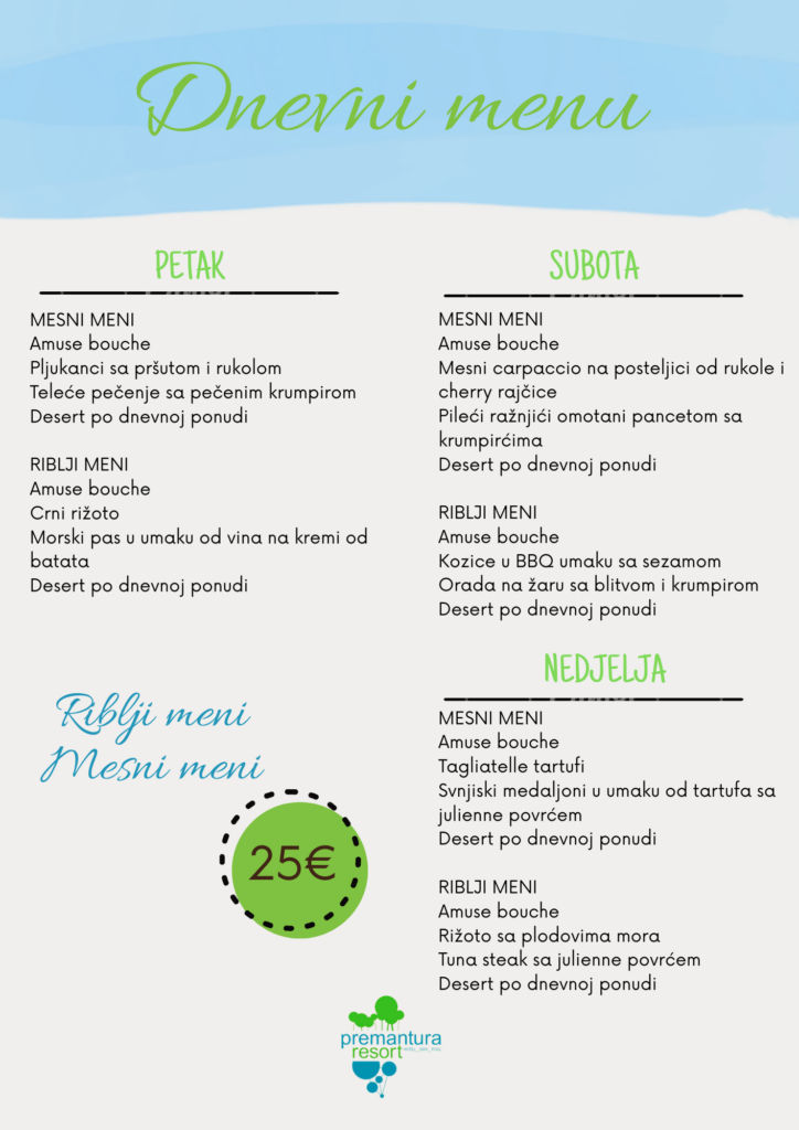 Otkrijte čari dnevnog menija koji se svakodnevno mijenja. Naša ponuda uključuje riblja i mesna jela u 4 slijeda, pripremljena od pomno biranih lokalnih i sezonskih namirnica. Svježina, kvaliteta i kreativnost na tanjuru — svaki dan iznova. Rezervirajte svoje mjesto i uživajte u jedinstvenom gastronomskom iskustvu.